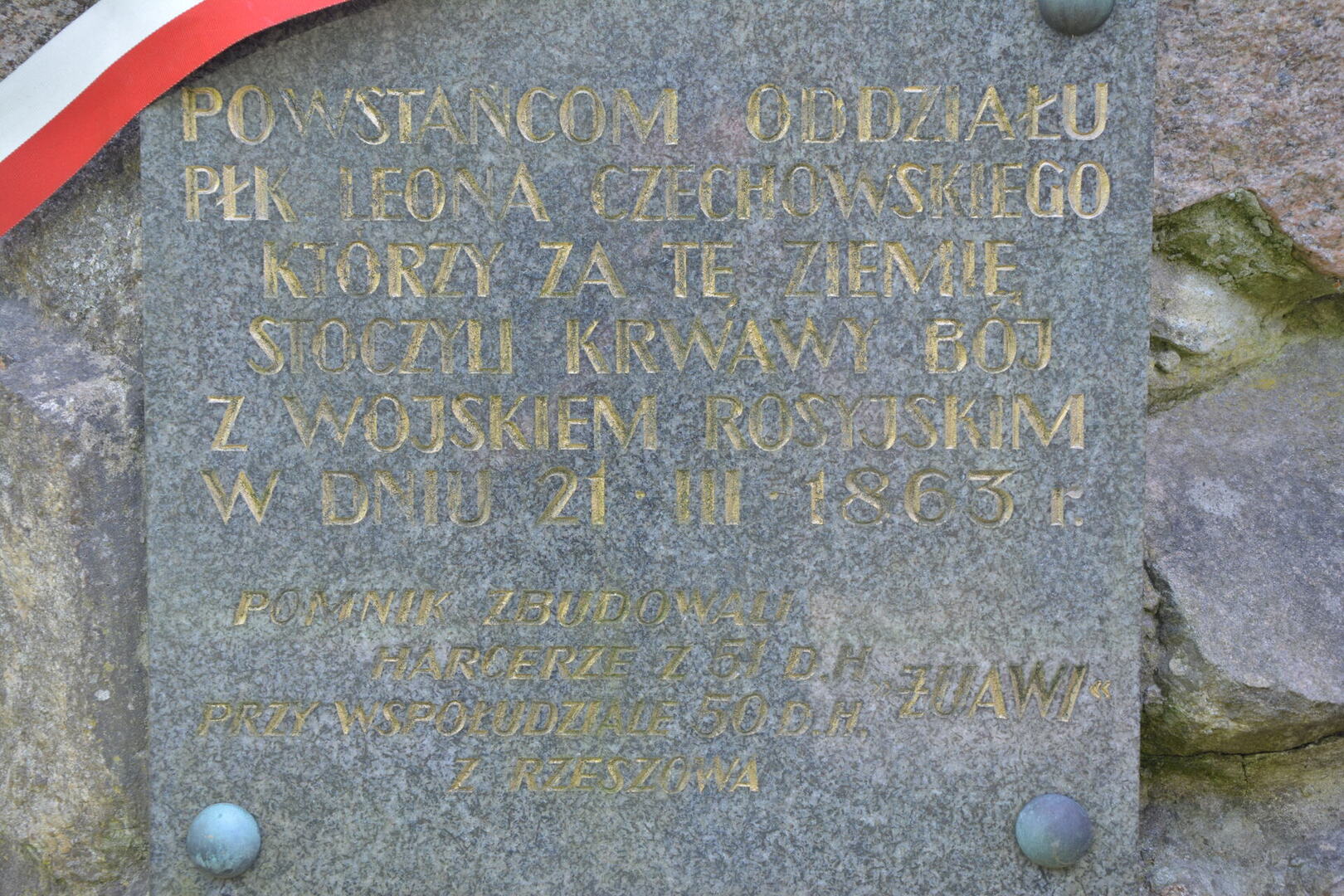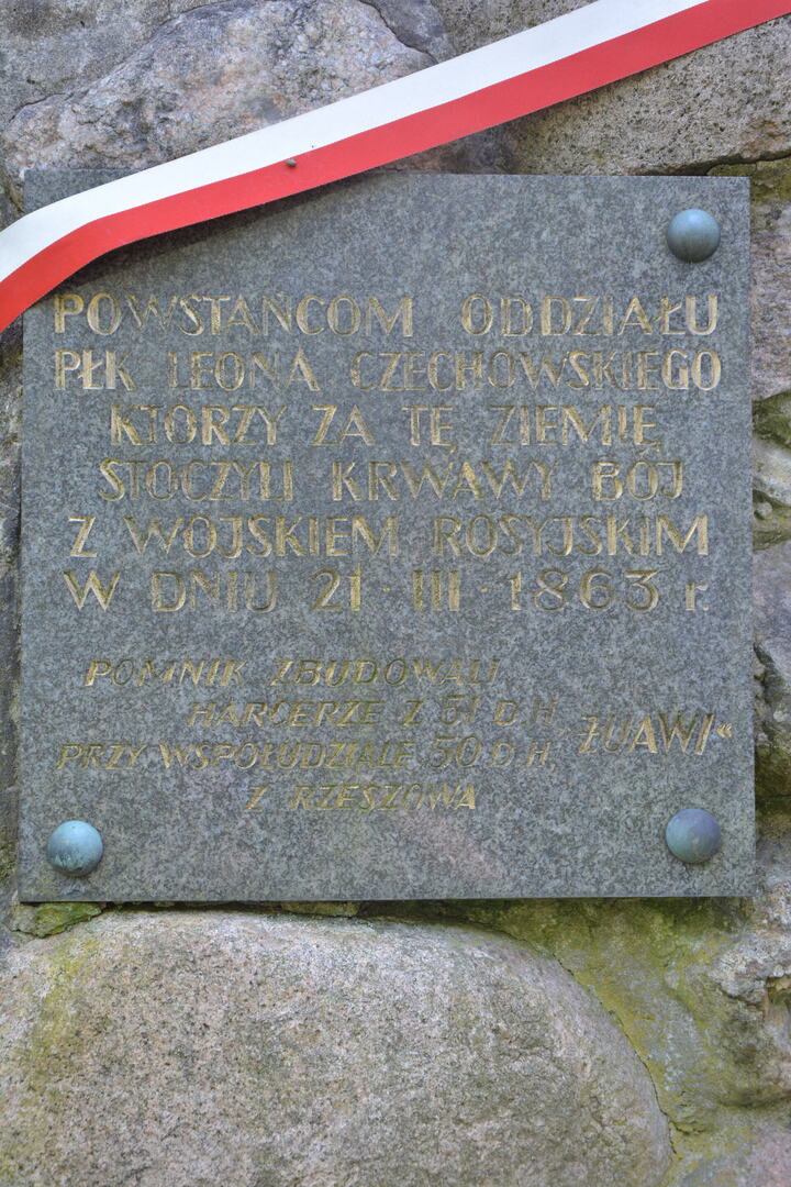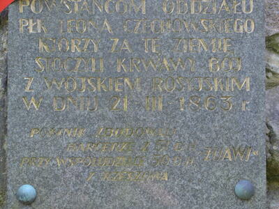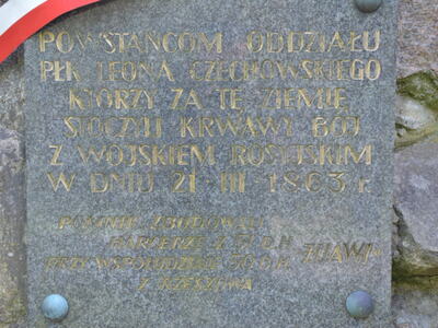 „Powstańcom oddziału płk Leona Czachowskiego, którzy za tę ziemię stoczyli krwawy bój z wojskiem rosyjskim w dniu 21 marca 1863r."